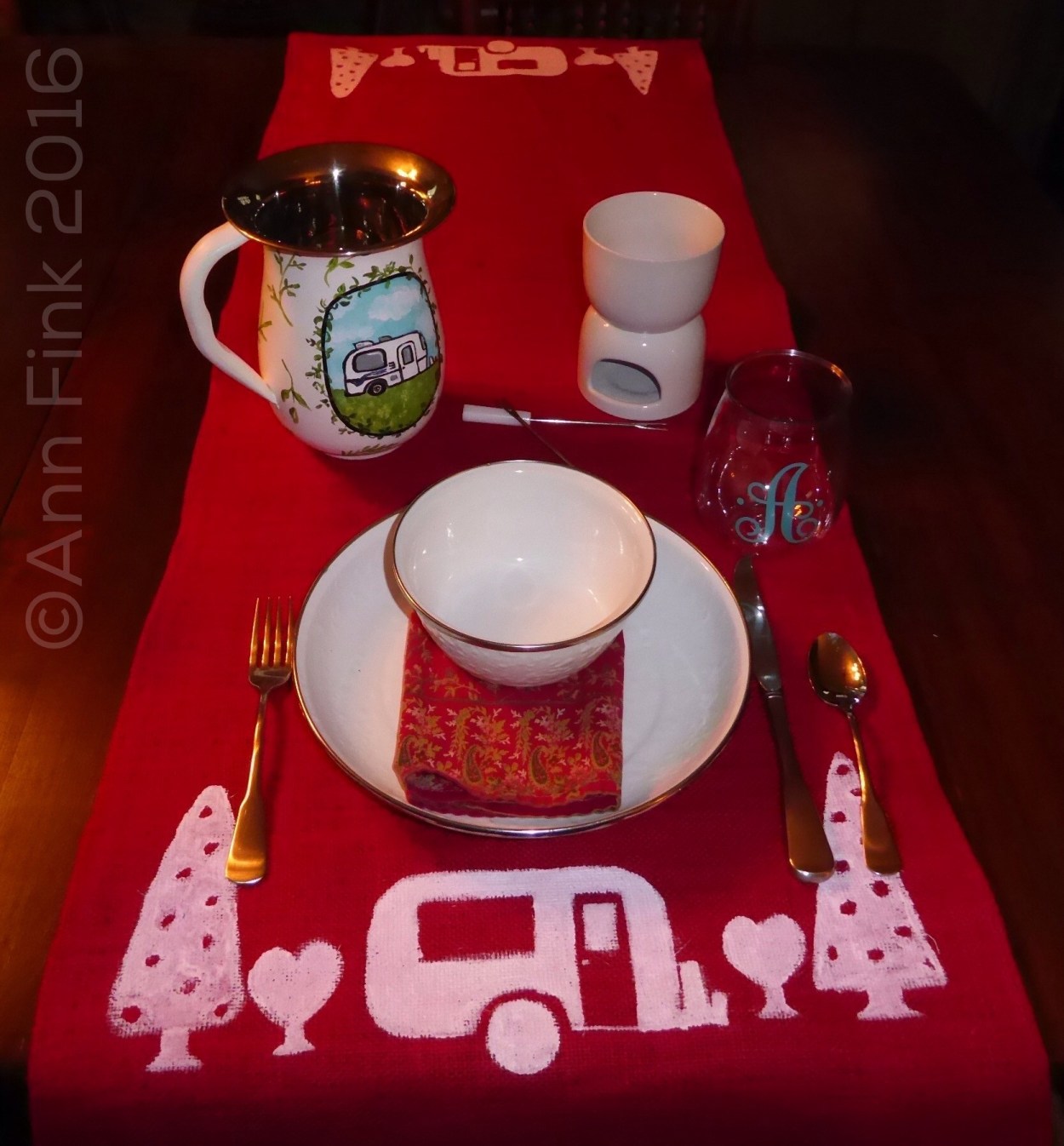 As a bonus, I had enough burlap to make a table runner for the picnic table. I simply sewed under the two ends and painted a Casita scene on each end using craft paint diluted with fabric paint medium (per the instructions on the bottle).
