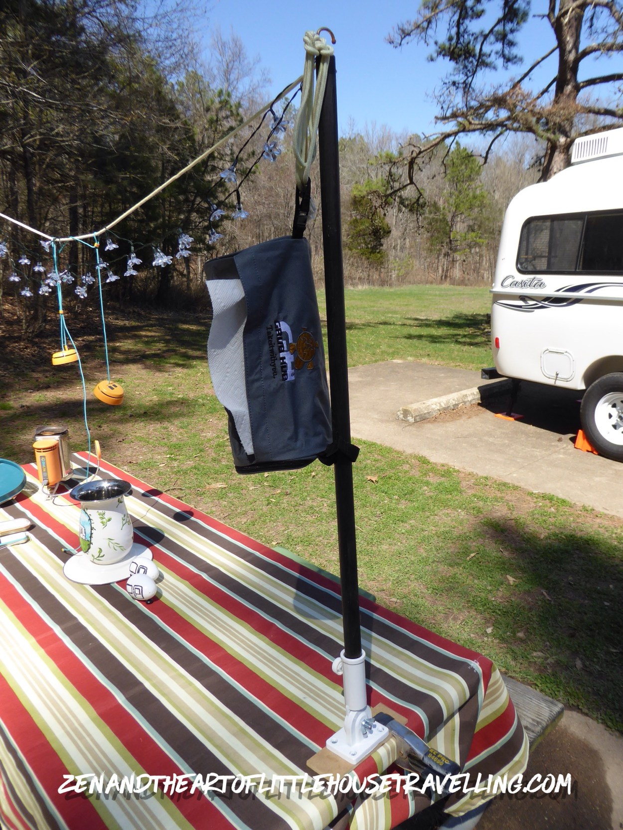 Along with the space for a trash can dilemma, fits the problem of a paper towel dispenser. Since cabinet space is much too precious and finding a place for a hanging bracket was a challenge– Not to mention, a bracket requires remembering to secure the roll for transit. There just isn’t any fun in realizing, once again, that you’ve forgotten and your Egg looks to be hit by TP vandals!