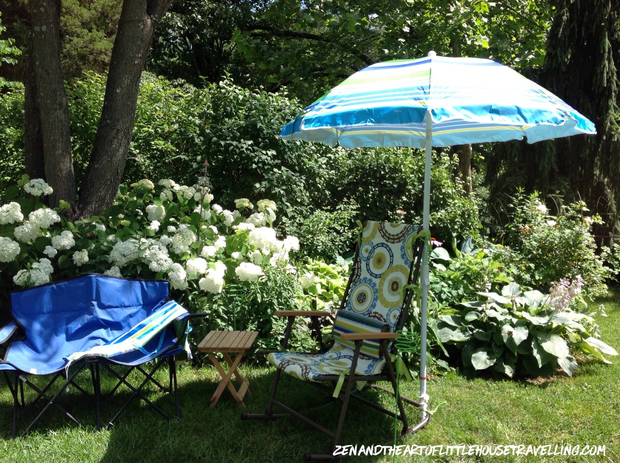 Thanks to Aldi grocery and $12.99, my zen camping chair now has the perfect shade cover. It’s a lightweight and very compact 6′ beach umbrella! I use my favorite twisty bendable flex-ties to affix it to the chair (see my post on sticks and lights for a picture of those flex-ties). Nirvana!