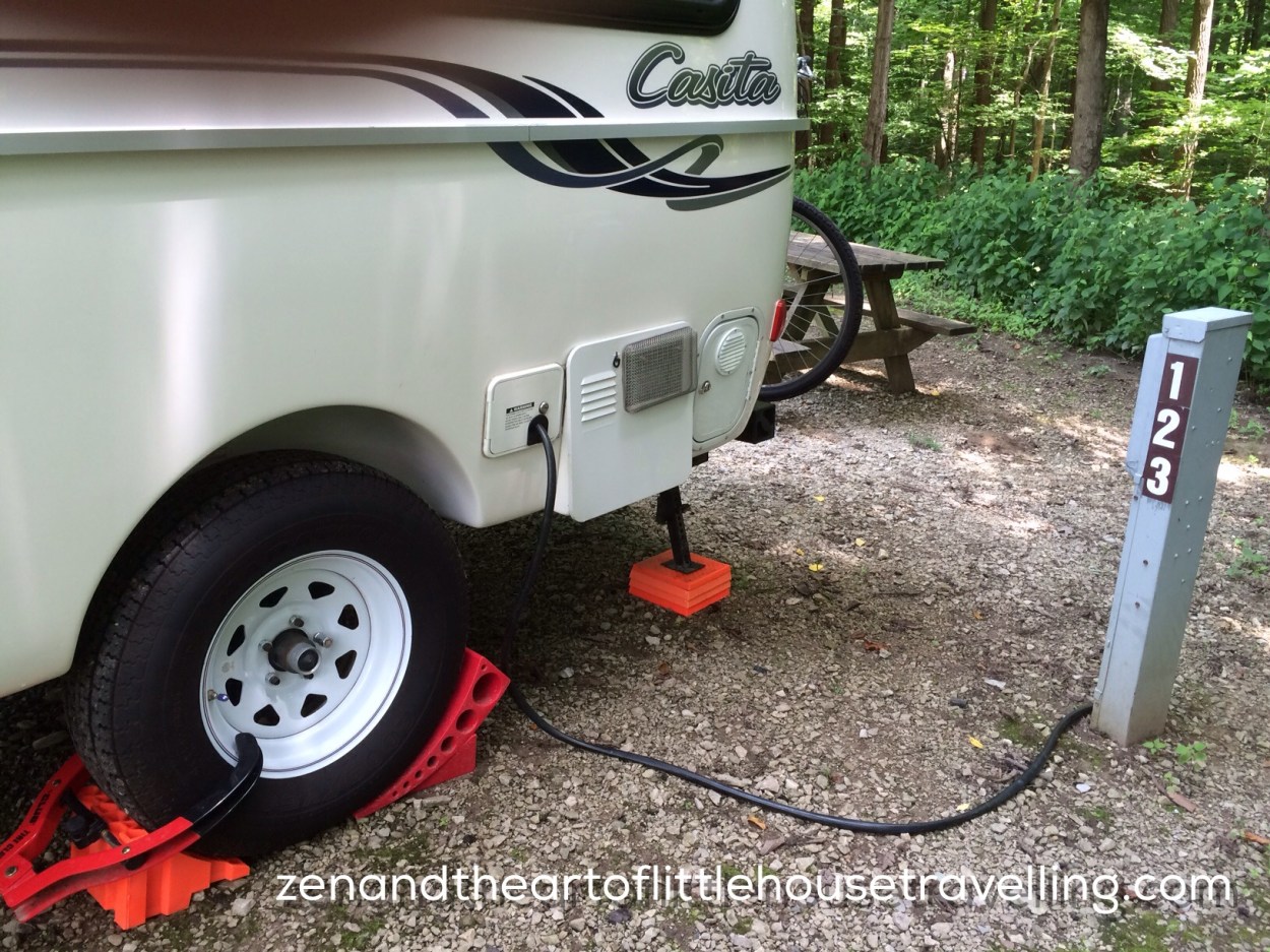 Once you back in, look at your front bubble level and see what wheel needs the Anderson Leveler, slip it in either in front or back of the wheel (it doesn’t seem to make any difference if we pull up onto it or back onto it as long as we chock both sides.) There are times when there is a parking block in back and pulling forward makes more sense so the stabilizers have room to come down on their pads. We have had to use a number of pads under the stabilizers from time to time because a back corner of a gravel parking spot may have washed out a little. In any event, bring a full kit of the leveling pads, just in case.