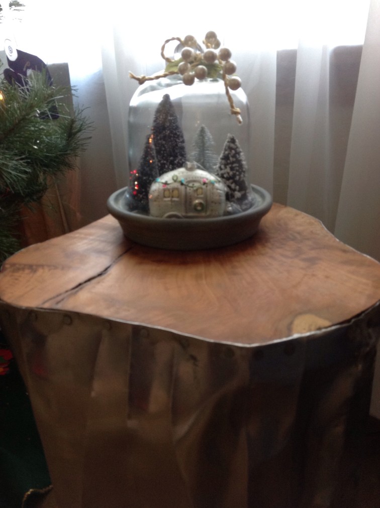 Though it’s not strictly a tree decoration, it does reside next to the tree on a tree stump table so it’s counting on this Third Day of Christmas.