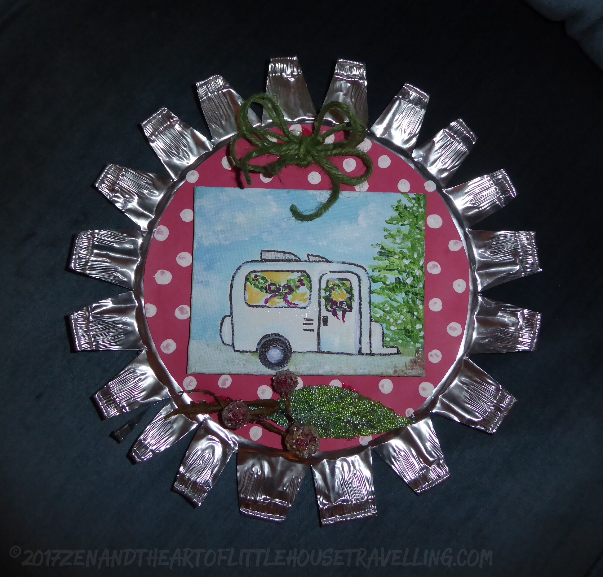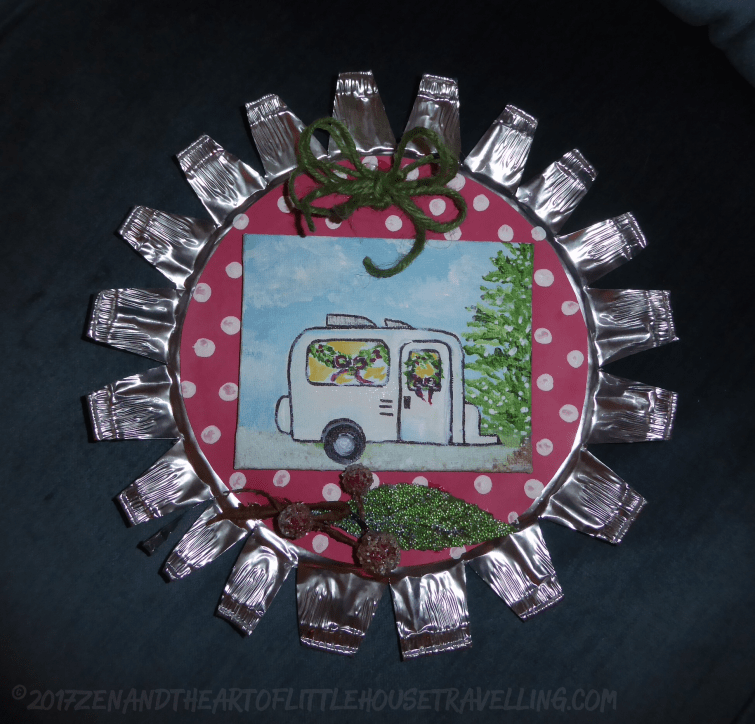 I cut the edge of the pie tin with shears (saving the wedge pieces for another day’s ornament.  I then bent and shaped the edges to help it reflect better and add more trash to treasure bling.